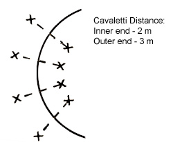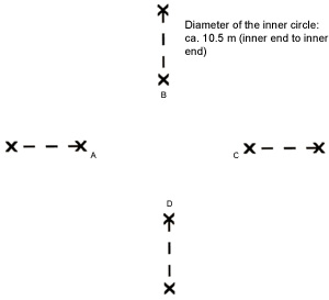 We can now move on to cavaletti on a circle again. This time, we will set up the cavaletti as shown below, and do three slightly different exercises. The distance between A and C is 10.5m, and the distance between B and D is 10.5m.
